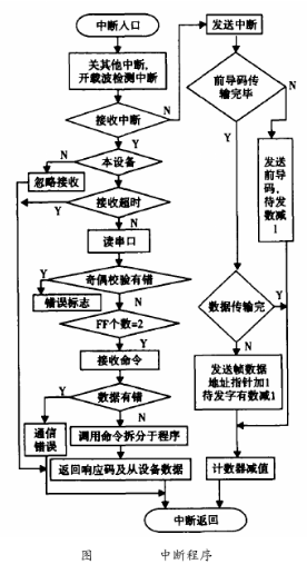 在HART通信中,鉆井泥漿流量計(jì)作為從設(shè)備進(jìn)行通訊,所以這里的軟件設(shè)計(jì)只是針對(duì)于從設(shè)備。HART通信采用水平和垂直校驗(yàn)的方法。當(dāng)檢測(cè)到接收數(shù)據(jù)有差錯(cuò)時(shí),則等到主設(shè)備命令幀發(fā)完后,通知主設(shè)備數(shù)據(jù)接收有誤。主設(shè)備則重新發(fā)命令幀,從而保證通信的準(zhǔn)確可靠。HART中斷子程序流程圖如圖6所示。由于HART通信為主從方式,HART幀中每個(gè)字節(jié)在物理層傳輸需要9ms左右,為了保證通訊的實(shí)時(shí)性,通訊程序采用串行口終端接收/發(fā)送。該中斷所要完成通信中的主要任務(wù),即接收和發(fā)送幀,幀的拆分和打包。