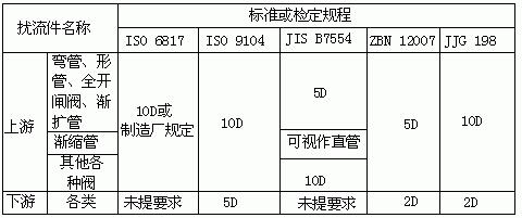 為獲得正常測量精確度,電磁流量傳感器上游也要有一定長度直管段,但其長度與大部分其它流量儀表相比要求較低。90°彎管、T形管、同心異徑管、全開閘閥后通常認(rèn)為只要離電極中心線(不是傳感器進口端連接面)5倍直徑(5D)長度的直管段,不同開度的閥則需10D;下游直管段為(2~3)D或無要求;但要防止蝶閥閥片伸入到傳感器測量管內(nèi)。各標(biāo)準(zhǔn)或檢定規(guī)程所提出上下游直管段長度亦不一致,匯集如表1所示,要求比通常要求高,這是由于為保證達到當(dāng)前0.5級精度儀表的要求。表1