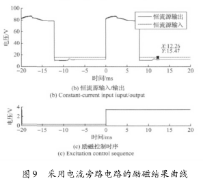 實(shí)驗(yàn)結(jié)果表明,高壓源向低壓源切換后,三端穩(wěn)壓器的工作特性致使的電流波動和低壓源供電情況下的恒流控制,會大幅延長勵磁電流的穩(wěn)態(tài)響應(yīng)時間。圖8所示勵磁電流約在17ms左右進(jìn)入穩(wěn)態(tài),圖9所示勵磁電流的穩(wěn)態(tài)響應(yīng)時間約為12ms。這表明,在采用三端穩(wěn)壓器搭建恒流控制電路的情況下,電流旁路電路能有效克服三端穩(wěn)壓器工作特性的影響,并能方便的實(shí)現(xiàn)電流超調(diào),加快勵磁電流的響應(yīng)速度。
