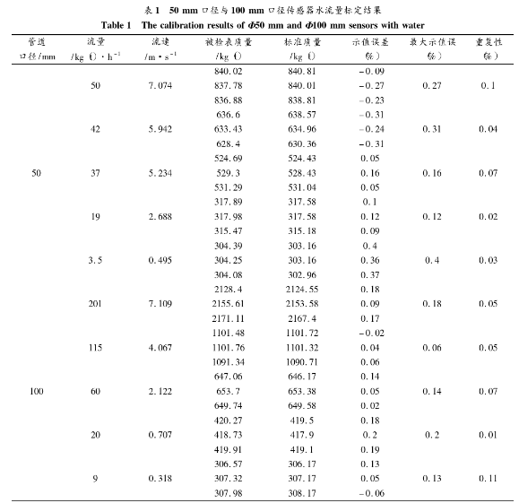 為了評測系統(tǒng)的實(shí)際應(yīng)用效果,進(jìn)行了水流量標(biāo)定實(shí)驗(yàn)。分別針對50mm口徑與100mm口徑的傳感器進(jìn)行標(biāo)定。系統(tǒng)勵磁方式采用方波勵磁,勵磁頻率為12.5Hz,管道*大流速為7m/s左右,*小流速為0.3 m/s左右,標(biāo)定結(jié)果如表1所示。