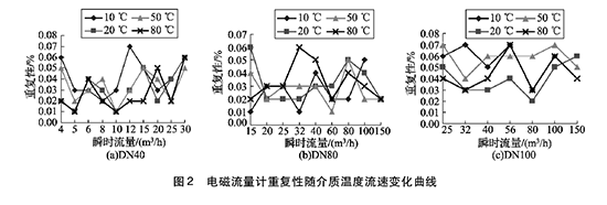 將實驗測得的給排水流量計在不同溫度及流速下的重復性數(shù)據整理,特性曲線如圖2所示,3組曲線分別對應DN40, DN80, DN100的3塊給排水流量計的重復性曲線。