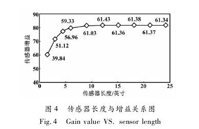 采用一臺(tái)日徑為6英寸、標(biāo)準(zhǔn)線圈的傳感器,改變傳感器長度,依次進(jìn)行試驗(yàn)室標(biāo)定試驗(yàn)。傳感器長度與增益的關(guān)系圖如圖4所示。當(dāng)傳感器長度為9. 1英寸時(shí),其增益為61. 03;但當(dāng)其長度繼續(xù)增加時(shí),增益變化較小;當(dāng)其長度6. 1英寸減小到0時(shí),增益從59. 33開始下降。也就是說,當(dāng)傳感器長度為6. 1-9. 1英寸時(shí),既有效利用了線圈產(chǎn)生的磁場(chǎng),又可使傳感器長度較短。