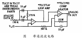 HART數(shù)字信號(hào)規(guī)范是峰值為1mA、平均值為0mA正弦交流電流信號(hào),此信號(hào)經(jīng)線路阻抗轉(zhuǎn)化為正弦交流電壓信號(hào),而HT2012輸入和輸出信號(hào)是0~5V的方波信號(hào),因此在HT2012和外部的HART信號(hào)之間還需要有濾波電路和整形電路。如圖3所示,由TLC27組成的濾波器是帶通濾波器,用來減少接收信號(hào)的噪聲干擾。濾波器還用來消除波形中的尖峰,從而使接收到的信號(hào)變得平緩。TLC37組成的數(shù)字方波產(chǎn)生回路把經(jīng)過TLC27濾波后的正弦波轉(zhuǎn)變成相應(yīng)的方波,以便于HT2012接收。