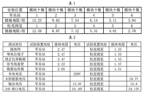 接地網(wǎng)的安裝與連接:接地網(wǎng)是整個(gè)乙二醇流量計(jì)防雷試驗(yàn)比較關(guān)鍵的一個(gè)內(nèi)容,能不能準(zhǔn)確的論證試驗(yàn)的有效性,必須保證接地網(wǎng)達(dá)到標(biāo)準(zhǔn)的接地電阻,通過對實(shí)地地電阻率的測試,初步選擇6個(gè)接地模塊埋設(shè)并配用降阻劑使用,邊安裝邊測試直到達(dá)到標(biāo)準(zhǔn)值后才引入等電位箱。在軍樂站和松花閥室安裝模塊并測試數(shù)據(jù)見表1。