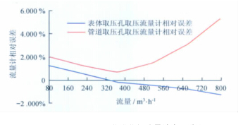 從以上數(shù)據(jù)表和曲線圖中可以看出:空氣流量計(jì)型號(hào)一定的情況下,用表體取壓孔取壓方式檢定流量計(jì)時(shí)流量計(jì)的線性度較好,用管道取壓孔取壓方式檢定流量計(jì)時(shí)流量計(jì)的線性度較差;流量測(cè)點(diǎn)相同的情況下,表體取壓孔取壓檢定方式的流量計(jì)誤差較小,管道取壓孔取壓檢定方式的流量計(jì)誤差較大;兩種取壓方式引起的誤差隨著流量的增大而逐漸增大,在流量為2 900m3/h時(shí)兩者相差近6.2%,遠(yuǎn)遠(yuǎn)超出了流量計(jì)的準(zhǔn)確度等級(jí)。所以,在空氣流量計(jì)的檢定過程中,應(yīng)避免在流量計(jì)表體取壓孔以外的地方取壓進(jìn)行檢定。