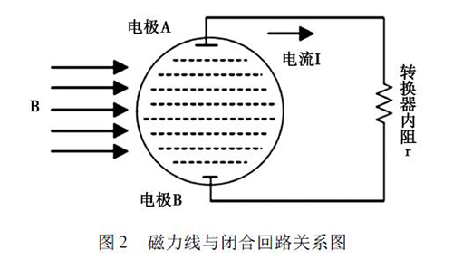 2. 1 正交干擾衛(wèi)生型卡箍電磁流量計的磁路系統(tǒng)包含有兩個勵磁線圈,而導管內(nèi)的液體與傳感器電極及轉(zhuǎn)換器結(jié)構(gòu)組成了一個閉合的回路,如圖2 所示。理論情況下,磁力線( 圖中B) 應與閉合回路相平行,但是由于裝配過程中的誤差,導致磁力線不可能完全平行于這一閉合回路,出現(xiàn)部分磁力線成一定角度穿過回路的現(xiàn)象,這引起了即使沒有液體流動的情況下,傳感器的電極上也會產(chǎn)生感應電動勢,就形成了正交干擾的基本形式。