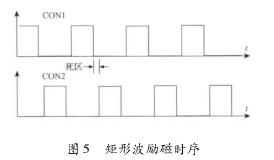 該電路主要由勵(lì)磁時(shí)序發(fā)生單元、三態(tài)緩沖器及隔離光耦組成。勵(lì)磁時(shí)序由雙氧水流量計(jì)系統(tǒng)的控制核心產(chǎn)生。采用DSP的EPWM外設(shè)模塊,通過(guò)設(shè)定其內(nèi)部定時(shí)器的工作模式發(fā)出所要求的勵(lì)磁頻率的勵(lì)磁時(shí)序PWM信號(hào)CT_1和CT_2。由于勵(lì)磁控制系統(tǒng)中的勵(lì)磁工作電源的電壓要比DSP的工作電源電壓高得多,為防止勵(lì)磁電路故障對(duì)系統(tǒng)控制核心產(chǎn)生致命影響,采用光耦將控制部分與勵(lì)磁部分進(jìn)行隔離。另外,由于DSP引腳的驅(qū)動(dòng)能力有限,所以在DSP與隔離光耦之間加入三態(tài)緩沖器以驅(qū)動(dòng)隔離光耦的輸入級(jí)。并且,DSP能夠通過(guò)GPIO口控制三態(tài)緩沖器上的使能引腳來(lái)使能和禁止勵(lì)磁,以在檢測(cè)到電路故障時(shí)迅速關(guān)斷H橋所有橋臂。該勵(lì)磁時(shí)序產(chǎn)生電路通過(guò)軟件編程可產(chǎn)生如圖5所示的單頻矩形波。在實(shí)際應(yīng)用中,由于組成H橋的達(dá)林頓三極管與MOS管導(dǎo)通與關(guān)斷的時(shí)間不一致,易在勵(lì)磁方向切換瞬間,產(chǎn)生上下橋臂同時(shí)導(dǎo)通的現(xiàn)象,反映在勵(lì)磁電流波形上為一幅值很高的窄脈沖。該脈沖電流不僅容易引起遲滯比較電路的誤輸出,從而導(dǎo)致高低壓切換電路與電流旁路電路的誤動(dòng)作,而且對(duì)恒流控制電路產(chǎn)生沖擊,減小三端穩(wěn)壓芯片的使用壽命,同時(shí)還會(huì)產(chǎn)生EMC電磁干擾,給測(cè)量精度帶來(lái)影響。所以實(shí)際應(yīng)用時(shí),如圖5所示對(duì)方波勵(lì)磁時(shí)序添加死區(qū),可以明顯減小上述現(xiàn)象。