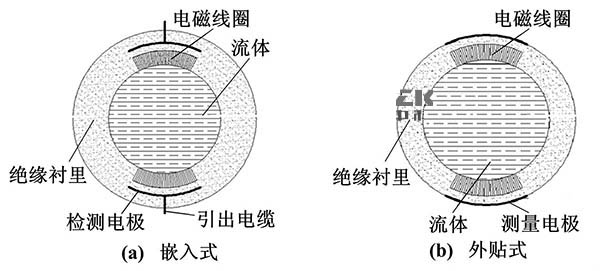 電極與被測流體通過絕緣管形成檢測電容,通過此電容來藕合流量信號。其主要的結(jié)構(gòu)形式按照電極的安裝位置可以分為兩種:電極嵌人測量管的絕緣襯里內(nèi)部(嵌人式)、電極貼在測量管外部(外貼式)。嵌入式結(jié)構(gòu)與普通管道式電磁流量計(jì)結(jié)構(gòu)相似,而外貼式大多是通過陶瓷表面金屬化技術(shù)將電極貼在測量管外。