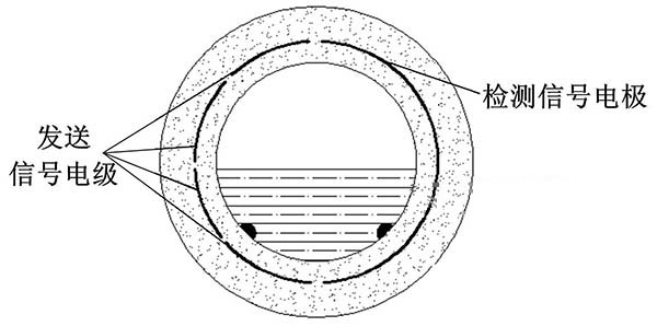 ③利用阻抗或信號衰減研制的非滿管管道式電磁流量計(jì)。這種結(jié)構(gòu)的非滿管管道式電磁流量計(jì)是當(dāng)前國內(nèi)研究的方向之一。其結(jié)構(gòu)是流量管底部貼一對信號發(fā)射電極,在流量管中間貼信號接收電極。由于信號在流體中傳播會產(chǎn)生衰減,且傳播時間越長,衰減越多,因此通過信號接收電極接收到的信號衰減量即可得知液面高度;同時該電極還能測量流體切割磁感線產(chǎn)生的電動勢,以此達(dá)到測量非滿管流量的目的。阻抗式或信號衰減非滿管管道式電磁流量計(jì)結(jié)構(gòu)簡圖如圖5所示。