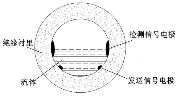 ①多電極式非滿管管道式電磁流量計(jì)。其底部是一對信號注人電極,中間有多對測量電極,頂端有一個滿管電極。在滿管情況下,該流量計(jì)與普通的管道式電磁流量計(jì)的功能相同,滿管情況下流體的橫截面積是固定的,此時計(jì)算流量值只需要測量流體的流速即可。當(dāng)流體非滿管時,滿管電極檢測到管道非滿狀態(tài),利用算法修正測量值,此時流量計(jì)的測量方式改成測量流體流速和液面高度。信號注人電極與在不同位置的三對測量電極共同工作,用于測量液位面的高度和流體的速度。多電極式非滿管管道式電磁流量計(jì)結(jié)構(gòu)簡圖如圖3所示。