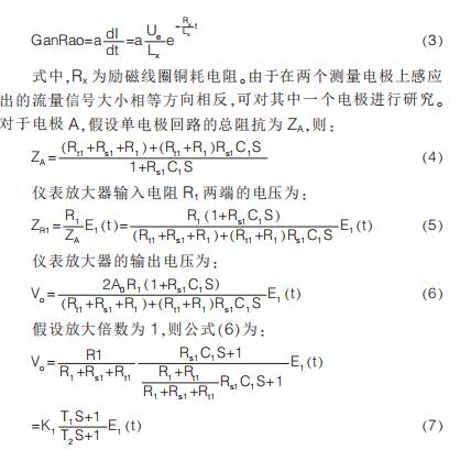 提出在硬件電路上加入模擬開關(guān), 干擾尖峰到來時(shí)斷開模擬開關(guān)避免干擾進(jìn)入后級(jí)電路,尖峰過去重新打開模擬開關(guān);K.Saito 等提出漂移校正法,先以高勵(lì)磁頻率進(jìn)行勵(lì)磁,在勵(lì)磁過程中插入低勵(lì)磁頻率提取用于漂移校正的非固定微分噪聲分量,但在插入的低勵(lì)磁頻率段漿液噪聲較大且很難將漿液噪聲與流量信號(hào)分離,此時(shí)的校正因子非單純的非固定噪聲分量,改進(jìn)措施是長(zhǎng)時(shí)間取平均值得到穩(wěn)定因子。 傳統(tǒng)方法是同步采樣保持法,即在磁場(chǎng)穩(wěn)定階段采樣。 其他消除干擾的方法有設(shè)置干擾補(bǔ)償機(jī)構(gòu)、控制勵(lì)磁電流變化率減小干擾幅值、矩形波代替梯形波、希爾伯特黃變換結(jié)合傅里葉變換和程控增益技術(shù)等。經(jīng)上述對(duì)現(xiàn)有的文獻(xiàn)分析與總結(jié)可知, 當(dāng)前消除微分噪聲主要從信號(hào)處理方面入手,并未對(duì)影響噪聲的因素加以研究。 本文建立電極測(cè)量回路等效模型,給出仿真模型搭建、參數(shù)取值和仿真結(jié)果分析。