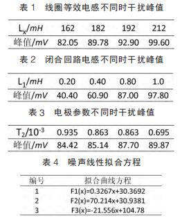 仿真試驗(yàn)中,設(shè)定線圈等效電感取值范圍為 162~212mH,間隔 10mH;閉合回路等效電感范圍 0.2~1mH,間隔為 0.2mH;雙電層電容、接觸電阻隨流體電導(dǎo)率變化而變化,電導(dǎo)率增大接觸電阻和雙電層電容減小而電荷傳遞電阻增大??稍O(shè)定電極接觸電阻、雙電層電容和電荷傳遞電阻范圍分別為 5~15kΩ、10~20μF 和50~60Ω,由公式(7)知,可用 T2 表示上述三者關(guān)系。 仿真參數(shù)取值不同情況下,通過 MATLAB 工具箱對(duì)仿真測(cè)量得到的干擾峰值進(jìn)行曲線擬合畫出相應(yīng)的曲線圖。 其中仿真數(shù)據(jù)和相對(duì)應(yīng)的曲線方程如表 1~表 4 所示,曲線圖如圖 4~圖 6。