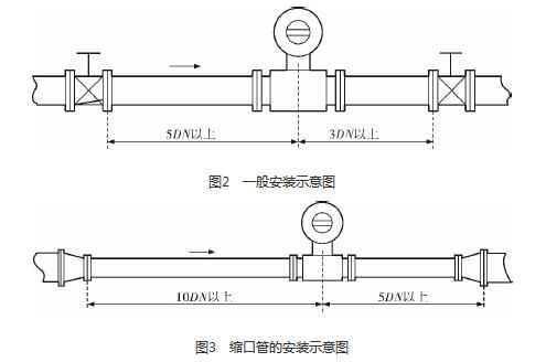 污水處理廠進(jìn)水流量計的安裝質(zhì)量對其測量結(jié)果的影響較大,因此在安裝時需要注意幾個問題。*先,污水處理廠進(jìn)水流量計直管段的選擇在配管時一定要按照要求進(jìn)行選擇,一般選擇流量計通徑與工藝管道通徑相同,即可滿足工程需要,而且安裝方便、壓力損失小,流量計直管段上游側(cè)的長度不少于5倍工藝管道直徑,下游側(cè)的長度不少于3倍工藝管道直徑(圖2)。但在流速太慢而又要求精度較高或需要變徑的應(yīng)用場合,可選擇通徑小于工藝管道通徑的流量計,以提高測量精度,此時流量計上、下游必須加裝異徑管,且進(jìn)口異徑管上游側(cè)應(yīng)有長于10倍工藝管道直徑的直管段,下游側(cè)應(yīng)有長于5倍工藝管道直徑的直管段(圖3)。