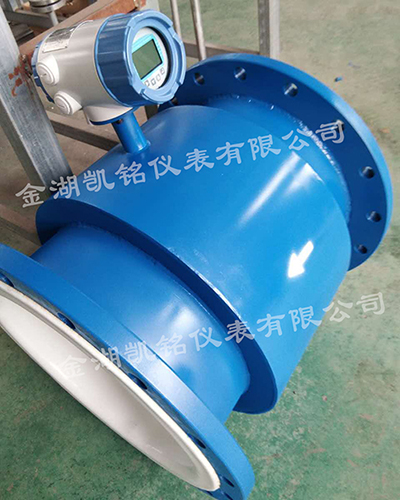 凱銘電磁流量計是以內(nèi)襯絕緣材料做為非導磁合金短管;兩只電極沿管徑方向穿通壁固定在測量管上,其電極頭與襯里內(nèi)表面基本齊平。勵磁線圈由雙向方波脈沖勱磁時,將在與測量管軸線垂直的方向上產(chǎn)生一磁通量密度為B的工作磁場;此時,如果具有一定電導率的液體流經(jīng)測量管,將切割磁力線感應出電動勢E,電動勢E正比于磁通量密度B,測量管內(nèi)徑d與平均流速V 的乘積。電動勢E(流量信號)由電極檢出并通過電纜送至轉(zhuǎn)換器。轉(zhuǎn)換器將流量信號放大處理后,可顯示流體流量,并能輸出脈沖,摸擬電流等信號,用于流量的控制和調(diào)節(jié)。