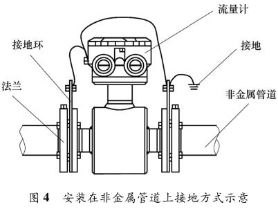 智能型防腐電磁流量計(jì)安裝在金屬管道上,安裝時(shí)將金屬管道與智能型防腐電磁流量計(jì)相連接,接地線再接入接地網(wǎng),如圖 3 所示。