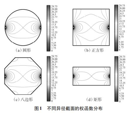 為考察不同異徑截面權(quán)函數(shù)分布的均勻性,使用上述方法對(duì)圓形、正方形、八邊形和矩形異徑截面的權(quán)函數(shù)分布進(jìn)行定性分析。為了便于對(duì)比,設(shè)置管道口徑為DN100,異徑部分截面積為3200mm2。所以,圓形異徑面半徑為32mm,正方形異徑面邊長為56.6mm,八邊形異徑面邊長為25.8mm,矩形異徑面長寬為80×40mm。仿真結(jié)果如圖1所示,為了便于對(duì)比,權(quán)函數(shù)等勢線大小從0開始,以0.25為步長遞增到30。由圖1(a)~圖1(d)可知,矩形異徑截面的權(quán)函數(shù)等勢線間距*大,即權(quán)函數(shù)變化梯度*小,權(quán)函數(shù)分布*均勻。