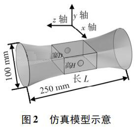 使用 Pro /E 軟件建立三維幾何模型,導(dǎo)入 COMSOL 軟件進(jìn)行有限元求解。仿真模型如圖 2 所示,電極連線為x 軸,連線中點(diǎn)為坐標(biāo)原點(diǎn),流體運(yùn)動(dòng)方向?yàn)?z 軸,傳感器管道口徑為 DN100,總長250 mm。異徑管部分初始結(jié)構(gòu)尺寸 L = 80 mm,D = 80 mm,H = 40 mm,圓形電極半徑為17 mm,伸出絕緣襯里的*大距離為 1. 5 mm。