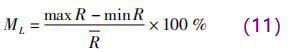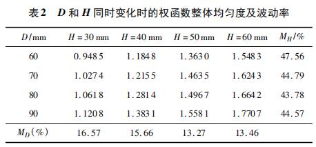 計(jì)算多組相同 D × H、不同 L 時(shí) xy 平面的權(quán)函數(shù)整體均勻度 R 及波動(dòng)率 ML,如表 1 所示。