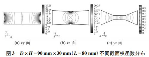 4) 圖 3( c) 、圖 4( c) 的 yz 面權(quán)函數(shù)分布表明,D = 90 mm時(shí)的權(quán)函數(shù)等勢線間距略大于 D = 60 mm 時(shí)的權(quán)函數(shù)等勢線間距,權(quán)函數(shù)變化梯度較小,且中心區(qū)域的權(quán)函數(shù)等勢線逐漸變?yōu)橹本€,因此 D = 90 mm 的權(quán)函數(shù)分布更均勻一些,但是兩者區(qū)別很小,即寬度改變對(duì) yz 面權(quán)函數(shù)分布影響很小。圖 4( c) 、圖 5( c) 的 yz 面權(quán)函數(shù)分布表明,H = 30 mm時(shí)的權(quán)函數(shù)等勢線間距較大,且中心區(qū)域的權(quán)函數(shù)等勢線逐漸變?yōu)橹本€,因此 H = 30 mm 的權(quán)函數(shù)分布更加均勻;
