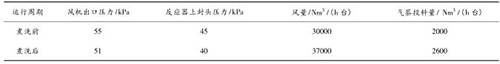 煤氣流量計煮洗吹掃后,裝置運行期間無燃爆事故,且裝置運行的風量明顯提高,系統(tǒng)阻力明顯降低,投料量增加?,F(xiàn)將煮洗前后的運行數(shù)據(jù)對比如下: