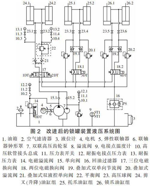 根據(jù)氪氣流量計在整個提升系統(tǒng)中的實際工況,對該裝置的液壓系統(tǒng)進(jìn)行技術(shù)改進(jìn),運用液壓集成技術(shù),現(xiàn)代節(jié)能理念,采用機(jī)電液一體化思路,改進(jìn)設(shè)計出的新型液壓系統(tǒng)如圖 2 所示。