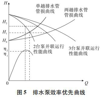 當(dāng)執(zhí)行多臺(tái)排水泵同時(shí)運(yùn)行時(shí),通過排水泵特性曲線與管路特性曲線的比較,選擇非常好的匹配排水泵與排水管數(shù)量,保證排水泵在非常好的新效率點(diǎn)運(yùn)行。如圖 5 所示。