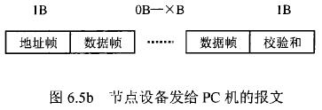 在測(cè)水流量計(jì)等節(jié)點(diǎn)設(shè)備和C機(jī)通信的過程中,由地址幀、命令幀、數(shù)據(jù)幀、校驗(yàn)和可組成各種功能不同的報(bào)文。由于采用主從工作方式來實(shí)現(xiàn)通信,測(cè)水流量計(jì)等節(jié)點(diǎn)設(shè)備僅能接收并執(zhí)行PC機(jī)發(fā)送來的控制命令,而不能發(fā)送命令給PC機(jī)。因此,由PC機(jī)發(fā)往流量計(jì)等節(jié)點(diǎn)設(shè)備的報(bào)文一般包括一個(gè)地址幀,一個(gè)命令幀,若干個(gè)數(shù)據(jù)幀和一個(gè)校驗(yàn)和,其報(bào)文格式圖.6a5所示;而由流量計(jì)等節(jié)點(diǎn)設(shè)備發(fā)往PC機(jī)的報(bào)文一般包括一個(gè)地址幀,若干個(gè)數(shù)據(jù)幀和一個(gè)校驗(yàn)和,其報(bào)文格式如圖6.5b所示。