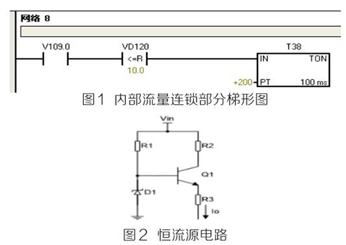 (2)PLC及模塊。PLC及模塊是自動(dòng)化控制系統(tǒng)主要設(shè)備,且PLC及模塊屬于高集成高精密電子設(shè)備,保持室內(nèi)整潔舒適,可以提高自動(dòng)化系統(tǒng)運(yùn)行穩(wěn)定性。PLC及模塊硬件運(yùn)行可靠,內(nèi)部控制程序是其控制核心軟件,如PLC硬件出現(xiàn)故障或損壞一般直接更換,但原內(nèi)部控制軟件無法上傳,整個(gè)控制系統(tǒng)成失控狀態(tài)。所以其內(nèi)部控制程序在調(diào)試驗(yàn)收合格后應(yīng)及時(shí)備份并做好標(biāo)記,為以后修復(fù)PLC故障提供保障。PLC系統(tǒng)的維護(hù)技術(shù)人員需掌握一定基礎(chǔ)PLC控制邏輯原理,對準(zhǔn)確判斷PLC故障點(diǎn)有很大的幫助。例如選礦廠水泵房S7-200系列PLC自動(dòng)抽水系統(tǒng)出現(xiàn)如下故障 :觸摸屏能控制變頻器啟動(dòng)水泵抽水,但在短時(shí)間內(nèi)會自動(dòng)停泵,導(dǎo)致無法正常抽水。通過故障現(xiàn)象可初步判斷PLC及模塊硬件設(shè)備正常,主要由于某個(gè)變量有問題導(dǎo)致連鎖停機(jī)。打開備份PLC控制梯形圖程序進(jìn)行相關(guān)分析,原來是高溫液體流量計(jì)瞬時(shí)流量數(shù)值做了連鎖,其在一定時(shí)間內(nèi)瞬時(shí)流量不大于10m 3 /h時(shí),自動(dòng)停泵,電磁流量模擬量輸出電流值僅為4ma且無變化,確定高溫液體流量計(jì)有故障??膳R時(shí)應(yīng)急維修,模擬量模塊輸入模擬電流值10ma~20ma之間一固定數(shù)值即可恢復(fù)正常運(yùn)行。制作簡單恒流源電路代替高溫液體流量計(jì)輸出的模擬電流量,實(shí)現(xiàn)解決水泵無法正常運(yùn)行的故障。