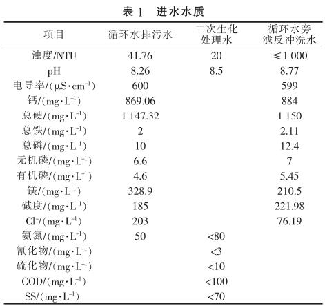 由表1可知,循環(huán)水排污水濁度較高,硬度大,主要是鈣鹽、鎂鹽含量較高;二次生化處理水是經(jīng)現(xiàn)有的生化處理系統(tǒng)處理后的氣化灰水、沖渣水等廢水,其氨氮、COD需進一步去除,以利于后續(xù)脫鹽處理系統(tǒng)的運行。