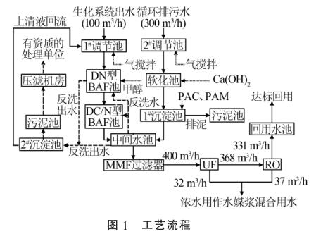 2種廢水在中間水池混勻后,通過泵提升進入保安過濾器,進一步去除細小的懸浮物后經(jīng)過增壓泵進入超濾膜(UF)處理系統(tǒng)和反滲透(RO)系統(tǒng),然后通過液體電磁流量計進行計量。反滲透出水直接進入回用水池達標回用,超濾濃水以及反滲透濃水用作水煤漿混合用水。污泥池中的污泥通過泵打入帶式機壓濾處理,濾液自流進入1#調(diào)節(jié)池。工藝流程見圖1。