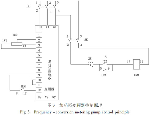 STD - Ⅲ型浮選工藝參數(shù)自動(dòng)測(cè)控系統(tǒng)通過(guò)雙膜盒差壓計(jì)測(cè)量原礦漿濃度; 采用地下水污水流量計(jì)測(cè)量原礦漿流量,由 PLC 計(jì)算出入浮干煤泥量和藥劑的瞬時(shí)添加量,用變頻式計(jì)量泵完成浮選藥劑的添加。通過(guò)上位機(jī)還可以打印小時(shí)、班、天及月的運(yùn)行數(shù)據(jù),更加有利于生產(chǎn)管理及技術(shù)分析,藥劑自動(dòng)原理如圖 2 所示,k1、k2、k3 是計(jì)算修正參數(shù)。以 PID 算法為核心,通過(guò)優(yōu)化控制程序計(jì)算出藥劑給定量,在捕收劑和起泡劑管道上分別安裝藥劑測(cè)量裝置,用于檢測(cè)藥劑的添加量。當(dāng)藥劑測(cè)量值小于藥劑給定量時(shí),PID 輸出增大,反之則減小。加藥泵變頻器控制原理如圖 3 所示。