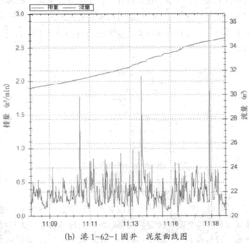 在固井全程的曲線中,也可以發(fā)現(xiàn)開始固井的時(shí)候.泥漿排量雜波較小,究其原因是剛開始固并時(shí),泥漿管線剛泄壓,管線中還是充滿了液體,雖然振動(dòng)強(qiáng)度雷同.但是葉片有阻尼,振幅較小.對(duì)其影響也較小。例如曲線圖的11;03: 00-11: 03: 53之間的泥漿排量沒有雜波。在港1-62-1固井過(guò)程中,水泥漿打了413澎,結(jié)果本應(yīng)該是0的泥漿,卻走數(shù)了23.0 m',其影響可謂巨大.并非通過(guò)普通的濾波或切除所能排除,必須執(zhí)行一個(gè)特殊算法。
