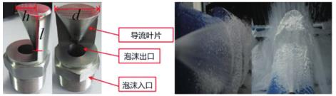 圖 1 為電弧風扇噴嘴的結構和噴霧,一種新型的噴嘴主要由一個衛(wèi)生型渦街流量計入口、出口和導流葉片組成。出流口的圓柱形設計降低了湍流強度。導流葉片類似于流線型尾部,產(chǎn)生類似于弧形風扇形狀的衛(wèi)生型渦街流量計噴霧,其形狀類似于掘進機的粉塵源。