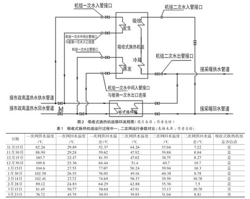 此熱力站高溫渦街流量計的一次網(wǎng)設(shè)計供回水設(shè)計溫度為 :120℃ /36℃,二次網(wǎng)設(shè)計供回水溫度為 :80℃ /60℃。在高溫渦街流量計工作流程中(見圖2),高溫?zé)嵩矗匆淮尉W(wǎng)供水)先進(jìn)入高溫渦街流量計,發(fā)生器作為驅(qū)動熱源,換熱后進(jìn)入板式換熱器,經(jīng)板式換熱器換熱后的低溫水再次回到高溫渦街流量計的蒸發(fā)器,放熱至36℃后返回電廠。熱用戶的二次網(wǎng)回水并聯(lián)后分別進(jìn)入高溫渦街流量計吸收器和板式換熱器,在吸收器和冷凝器及板式換熱器中分別進(jìn)行熱交換,然后一起供給熱用戶。上述過程就是在高溫渦街流量計啟動時,熱力站內(nèi)的實際供熱流程,在供暖季的初期和末期,可以關(guān)閉高溫渦街流量計,仍然利用板式換熱器單好換熱。