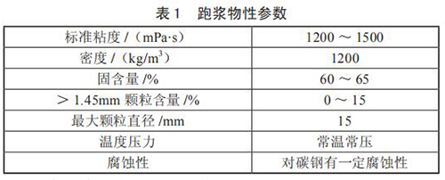 對(duì)跑漿進(jìn)行分析后發(fā)現(xiàn),跑漿是一種由煤漿和一些雜質(zhì)混合而成的半流體物質(zhì),當(dāng)實(shí)驗(yàn)室氣體流量計(jì)使用煤倉中煤堆中上部煤時(shí),由于煤質(zhì)較好,跑漿中小煤塊極少,性質(zhì)同正常煤漿,只是固含量稍高;而使用煤堆底部的煤時(shí),煤質(zhì)差實(shí)驗(yàn)室氣體流量計(jì)研磨不充分,跑漿中含有約 15% 的小煤塊,分析后的跑漿物質(zhì)參數(shù)如表 1 所示。