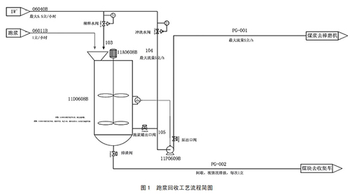 通過以上煤漿提濃通用方法優(yōu)缺點(diǎn)比較可以了解到,在現(xiàn)有設(shè)計(jì)條件基礎(chǔ)上,煤漿濃度提升會(huì)帶來一定設(shè)備損耗及能源損耗。針對(duì)這種情況,為了達(dá)到節(jié)能而保證實(shí)驗(yàn)室氣體流量計(jì)不跑漿,對(duì)于磨機(jī)跑漿問題進(jìn)行改善,對(duì)跑漿進(jìn)行回收,重新送回磨煤機(jī)進(jìn)行二次研磨,降低了實(shí)驗(yàn)室氣體流量計(jì)入口原料煤的粒度;同時(shí)降低了人員勞動(dòng)強(qiáng)度,改善了現(xiàn)場衛(wèi)生情況。具體跑漿回收裝置設(shè)計(jì)流程如圖 1 所示。