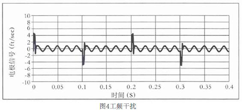 工頻干擾是硫酸管道流量計(jì)常見的干擾源。當(dāng)流量計(jì)處于電源形成電磁場(chǎng)中時(shí),由于分布電容的存在,以電磁波的輻射形式干擾電極信號(hào),或者是由供電電源引入的工頻串?dāng)_,工作現(xiàn)場(chǎng)的工頻共模干擾,其產(chǎn)生的物理機(jī)理均是電磁感應(yīng)原理。幅度與流量信號(hào)相比,往往要大幾個(gè)數(shù)量級(jí),頻率與供電電源頻率相同。如圖4所示,線圈驅(qū)動(dòng)頻率為5Hz的電極信號(hào),被耦合了50Hz的工頻干擾,幅度大概相當(dāng)于1feet/s。