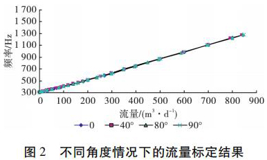 為了考察井眼斜度變化對電磁流量計測量流量的影響,開展了非集流高壓電磁流量計在不同斜度情況下的流量測量模擬實驗。模擬實驗在大慶油田多相流實驗室進行,儀器外徑 38 mm,模擬井筒內(nèi)徑為 124 mm,實驗介質(zhì)是水,傾斜角度分別為 0°、40°、80°和 90°( 水平) ,流量范圍為 5 ~ 850 m3 /d。實驗結(jié)果表明,在儀器居中條件下,井眼斜度變化對電磁流量計的儀表常數(shù)沒有影響,滿量程誤差不大于 4% ,因此可以應用高壓電磁流量計進行水平井注水剖面測量。不同角度情況下的實驗結(jié)果如圖 2 所示。