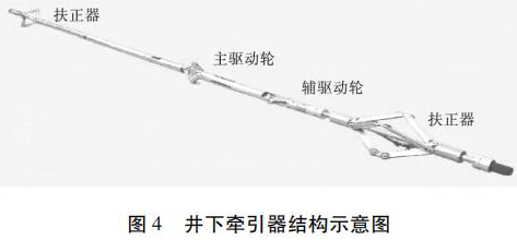 牽引器采用的是 Sondex 公司的牽引器,如圖 4所示。儀器外徑 54 mm,長度 7.4 m,牽引力 273 kg,耐壓103 MPa,耐溫 150 ℃,牽引速度 540 m/h。牽引器連接于電纜頭和測井儀器之間。在水平段和造斜段儀器不能靠自重下放,利用牽引器可以將儀器推送到測井目的層段。井下牽引器由兩組呈 90°交叉分布的驅(qū)動臂和扶正器組成。在進行井下儀器牽引時,*先打開牽引器驅(qū)動臂,使驅(qū)動臂端部的驅(qū)動輪支撐到套管壁并保持足夠的正壓力,然后驅(qū)動輪旋轉(zhuǎn)實現(xiàn)對儀器的推送。井下儀器牽引過程可在地面進行人工控制,通過控制命令和調(diào)整供電電壓可控制井下牽引速度和方向。該牽引器提供了多種井下測量參數(shù),包括電纜頭電壓和張力、牽引速度、接箍深度等數(shù)據(jù),所有這些沿井身測量到的參數(shù)均可在地面顯示出來,使施工具有安全性和可操作性。當斷開電源時,驅(qū)動臂在外力作用下可收回,保證儀器安全取出。