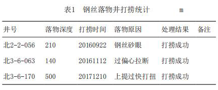 表1為氣體轉(zhuǎn)子流量計打撈統(tǒng)計表,可以看出自2016年9月開始即在現(xiàn)場進(jìn)行了應(yīng)用。為了展示試驗成果的普遍性,分別從不同注入方式、不同落物深度、不同落物原因的角度,共應(yīng)用3口鋼絲落物井,打撈成功為100%。
