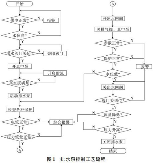 排水泵進(jìn)行自動(dòng)化控制模式后,當(dāng)水倉水位達(dá)到開泵要求,PLC 自動(dòng)檢測電動(dòng)閥門、球閥、供電電壓等是否正常后,啟動(dòng)真空泵進(jìn)行抽真空,當(dāng)水泵真空度符合開泵要求時(shí)便啟動(dòng)排水泵。排水泵正常運(yùn)轉(zhuǎn)后 PLC 時(shí)時(shí)收集運(yùn)行數(shù)據(jù)進(jìn)行比對(duì),當(dāng)發(fā)現(xiàn)運(yùn)行數(shù)據(jù)比對(duì)出現(xiàn)差異時(shí)影響到排水泵正常運(yùn)轉(zhuǎn)時(shí),會(huì)發(fā)出停泵命令。排水泵控制工藝流程如圖 1 所示。