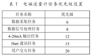 下面以電磁流量計為例說明基于 μC/OS-III 的人機界面設(shè)計。 先將 μC/OS-III 移植到 Cortex-M3 處理器上,這里選用的是 STM32F103VET6 。電磁流量計的應(yīng)用程序若按照上節(jié)的任務(wù)種類劃分有: 數(shù)據(jù)采集任務(wù)、數(shù)據(jù)處理任務(wù), 4~20mA輸出任務(wù), Hart 通訊任務(wù)以及用戶交互任務(wù)。 先對不同的任務(wù)進行優(yōu)先級的劃分,如表 1 所示。