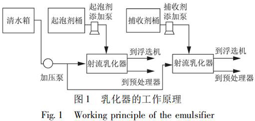 選煤廠浮選藥劑乳化裝置是將藥劑和水制成乳化液,實現(xiàn)藥劑的合理使用,將對浮選效果和節(jié)約藥劑起到一定的作用。在使用中可根據(jù)藥劑和水的配制比例觀察藥劑的乳化效果,通過乳化器操作箱內(nèi)的的電位器調(diào)整水泵轉速,即調(diào)整乳化壓力。自動加藥控制是根據(jù)入浮流量與入浮濃度的檢測結果,控制起泡劑與捕收劑的加入。乳化器的工作原理如圖 1 所示。