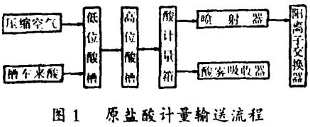 用陽離子交換樹脂制水要用酸作為再生劑。國內(nèi)電廠多選用鹽酸。鹽酸用傳統(tǒng)的箱式計量方法,使系統(tǒng)操作復(fù)雜,安全性能降低,還會嚴重污染環(huán)境。一種用工業(yè)用水流量計代替鹽酸計量箱的負壓輸送鹽酸系統(tǒng)能克服上述缺點。該系統(tǒng)自運行以來,使用情況良好,維護方便,受到工人們的歡迎。