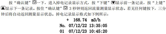 本功能只適用于帶有掉電計(jì)時(shí)功能的轉(zhuǎn)換器。儀表內(nèi)部設(shè)有不掉電實(shí)時(shí)時(shí)鐘,能夠自動(dòng)累計(jì)掉電時(shí)間多達(dá) 10000 小時(shí),掉電次數(shù) 10000 次,同時(shí)可保存 40~256 條掉電、上電的時(shí)間以及掉電時(shí)刻的瞬時(shí)流量記錄。當(dāng) 40~256 次掉電記錄記滿(mǎn)后,將循環(huán)保存新的掉電記錄。