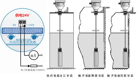 一體式投入式液位計若是安裝在靜止的深井、水池中時,一般把內(nèi)徑①45mm 左右的鋼管(不同高度打若干小孔,以便水通暢進入管內(nèi))固定于水中,然后將靜壓投入式液位計放入鋼管中就可以使用。不過要記得液位計的安裝方向要是垂直的,安裝位置需要遠離液體出入口及攪拌器。