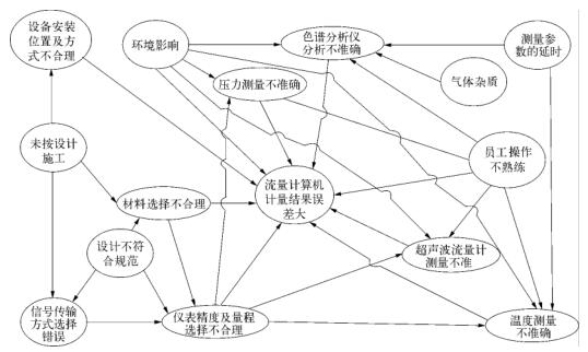 制藥廠污水流量計量系統(tǒng)計量的準(zhǔn)確性既與制藥廠污水流量計本體有關(guān),也和壓力、溫度測量儀表、色譜分析儀以及流量計算機等設(shè)備的可靠性有直接關(guān)系。此外,在員工操作、環(huán)境影響、設(shè)計選型、設(shè)備安裝等方面也會一定程度影響制藥廠污水流量計量的準(zhǔn)確性,其影響因素復(fù)雜多樣。電磁計量系統(tǒng)計量準(zhǔn)確性影響因素關(guān)聯(lián)關(guān)系如圖2所示。在實際生產(chǎn)應(yīng)用中,對制藥廠污水流量計量準(zhǔn)確性造成較大影響的主要是噪音、液體計量雜質(zhì)、氣體組分分析以及壓力、溫度測量這四個方面。