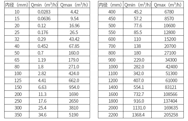您可以根據(jù)自身工藝管道的實(shí)際流量對(duì)應(yīng)上表中的流量來(lái)選擇相應(yīng)口徑規(guī)格的流量計(jì),盡可能選擇與工藝管道相同口徑規(guī)格的流量計(jì)。