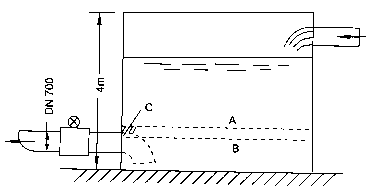 案例4 廣西某水廠在郊區(qū)山頭設置清水池,利用水池高度勢能發(fā)送成品水。運行人員反映計量出水量的DN700mm酸堿污水流量計有時候流量顯示不穩(wěn)。晃動達百分之十幾到百分之二十,誤差也大,估計相差約20%?,F場考查發(fā)現水池如圖7-9所示安裝流量傳感器,水位高度不足就會卷入氣泡,甚至流量傳感器測量管內不能充滿。如水位降至A線時,雖高出吸入口頂端,但高出不多,還會在C處產生旋渦,將水位表面空氣卷入形成氣泡,使顯示晃動;若水位降到B,測量管將不滿管。我們建議如圖虛線所示裝一彎頭,擴大水池有效容量,減少吸入氣泡的機會,彌補原設計的不足。這類實例是經常遇到的。